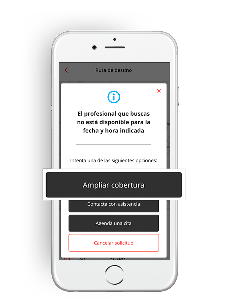 Sí en el mapa no se muestran profesionales disponibles, puedes seleccionar Ampliar Cobertura para que te muestre un radio más amplio en la ciudad, también puedes cerrar la ventana emergente y desplazarte por el mapa.